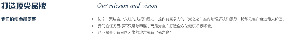 2012年公司斥巨資從德國專業(yè)空氣研發(fā)實(shí)驗(yàn)室引進(jìn)銳鈦型納米二氧化鈦研發(fā)成果,同時與國內(nèi)知名高校進(jìn)行合作,成立“光之吻”品牌,致力于為人類創(chuàng)作純凈,健康的呼吸環(huán)境,成為你身邊的健康衛(wèi)士,實(shí)現(xiàn)365天健康呼吸的夢想,目前是同類產(chǎn)品中最有競爭力的品牌之一。